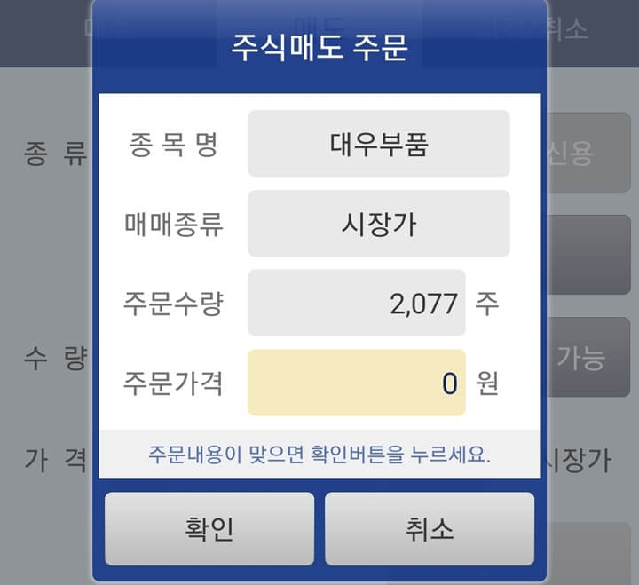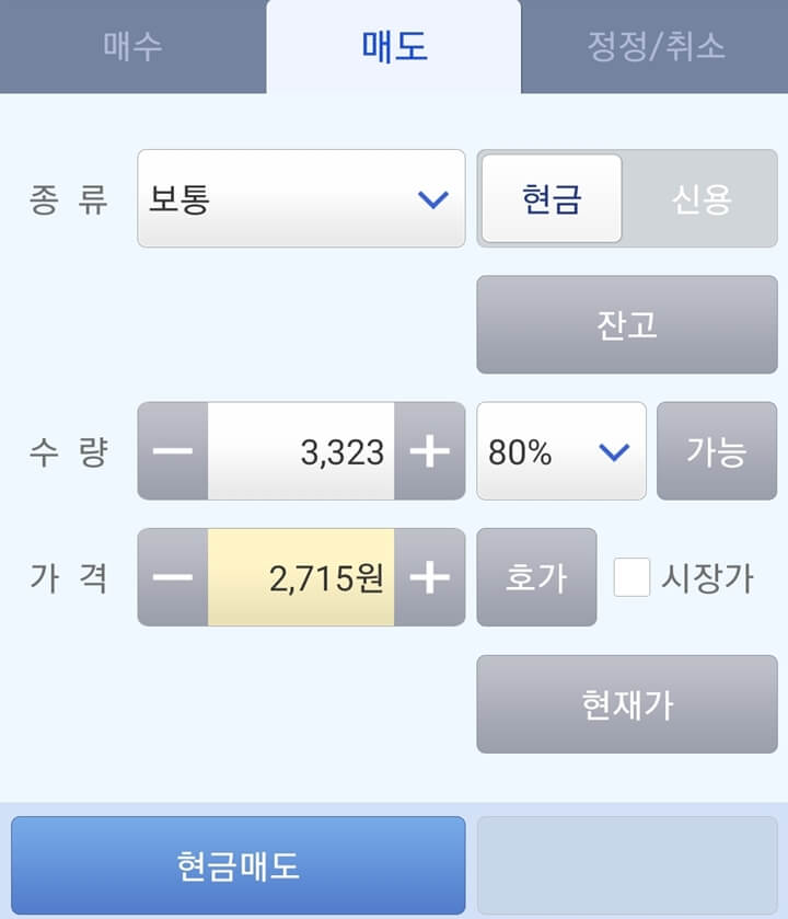 이 화면에서 "현금매도"를 누르고 "확인"을 누르면 매도 주문이 들어갑니다. 시장가 매도라 즉시 매매가 이뤄집니다.