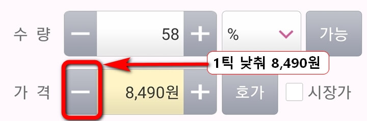이번엔 1틱을 낮춰 8,490원을 선택하고 똑같은 방법으로 50만원치 수량을 자동하여 주문을 넣습니다.