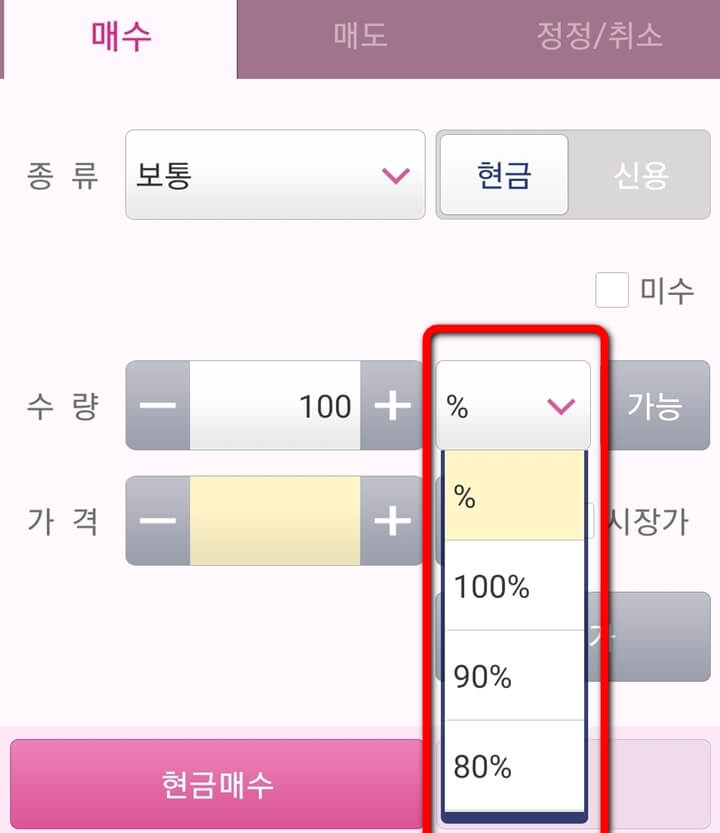 수량 오른쪽에 "%"를 터치하면 100%~10% 사이의 비율을 선택할 수 있는데요. 예수금 대비 30%, 50% 등으로 선택할 수 있어서 분할매수할 때 편리합니다.