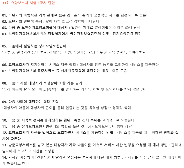 [33회 요양보호사 기출문제] 1교시 시험 답안