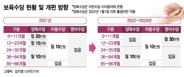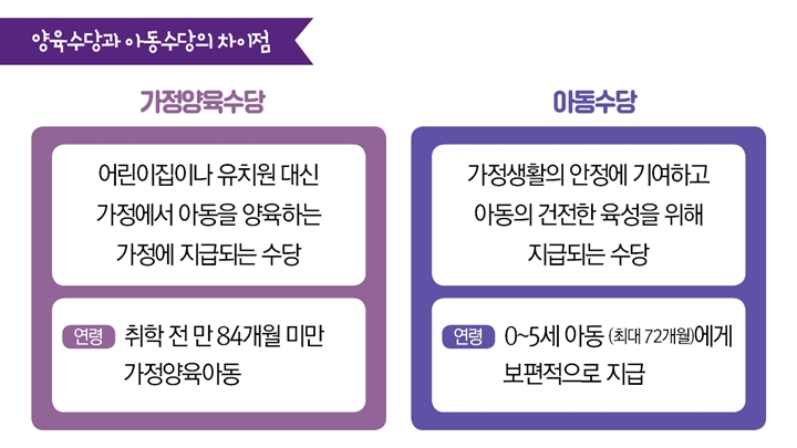 아동수당은 0세에서 만 7세까지 재산에 상관없이 무조건 10만원씩 다른 수당과 중복 지급이 되고 양육수당은 가정에서 아이를 돌볼 경우 역시 재산과 상관없이 나이에 따라 10만원에서 20만원이 지급됩니다. 그런데 보육료는 나이에 따라 월 26만원 에서 72만 6천원 까지 지원되기 때문에 맞벌이 부부가 아니더라도 아이를 어린이집에 보내는 것이 더 유리합니다.