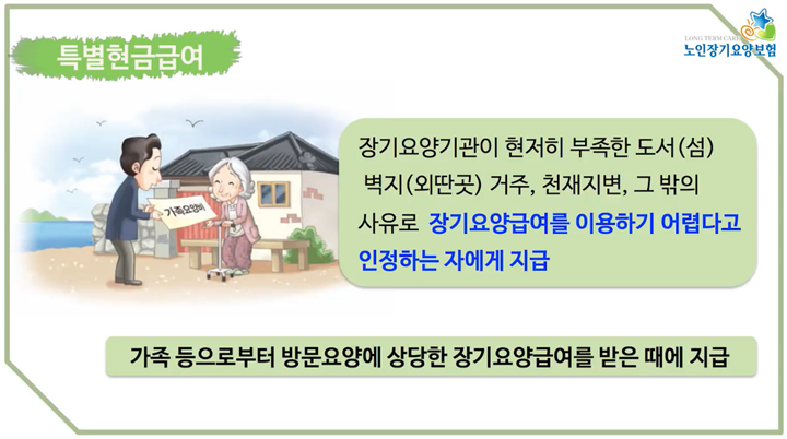 이렇게 한번 장기요양 등급을 받게 되면 불편한 정도에 따라 지원금이 지급되지만 집 가까운 요양시설이 없거나 요양 시설이 부족한 도서 지역에 거주하거나 또는 감염병 환자 라던지 정신장애가 있다던지 신체적 변형 등으로 다른 사람들과의 접촉을 꺼리는 어르신이 계시다면 시설이나 방문요양 서비스 지원금 대신에 현금으로 월 15만원을 받을 수 있습니다.
