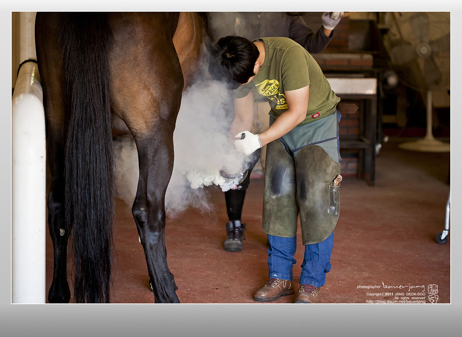 선택한 편자나 제작한 편자를 말의 발굽에 장착하는 것은 그 다음의 일입니다. 이때에는 많은 힘이 요구됩니다. 왜냐하면 편자를 장착하기 위해서는 말의 다리를 들어서 굽을 젖혀야 하는데, 이를 위해서는 약 20~25㎏정도의 무게를 드는 것과 같은 힘이 요구된답니다. 그래서 이 때는 말의 소유주나 말을 다루는 조교와 함께 힘을 합하기도 합니다.