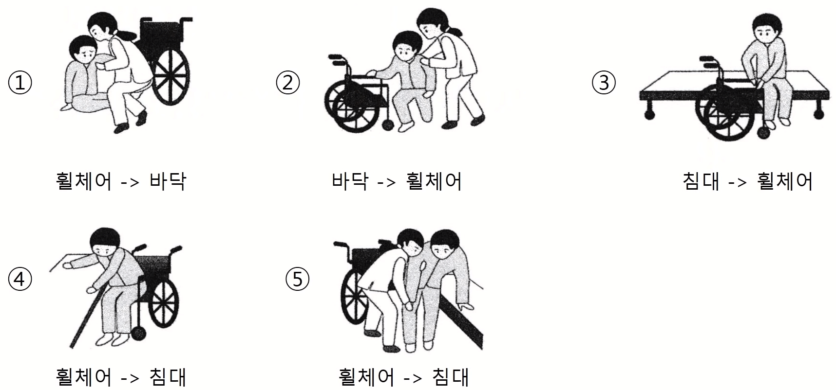 1. 휠체어를 사용하는 오른쪽 편마비 대상자의 이동 방법으로 옳은 것은?