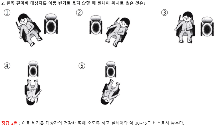 정답 2번 : 이동 변기를 대상자의 건강한 쪽에 오도록 하고 휠체어와 약 30~45도 비스듬히 놓는다.