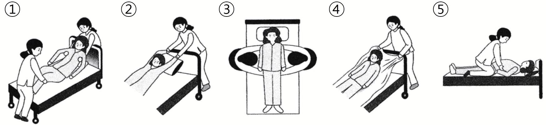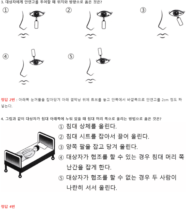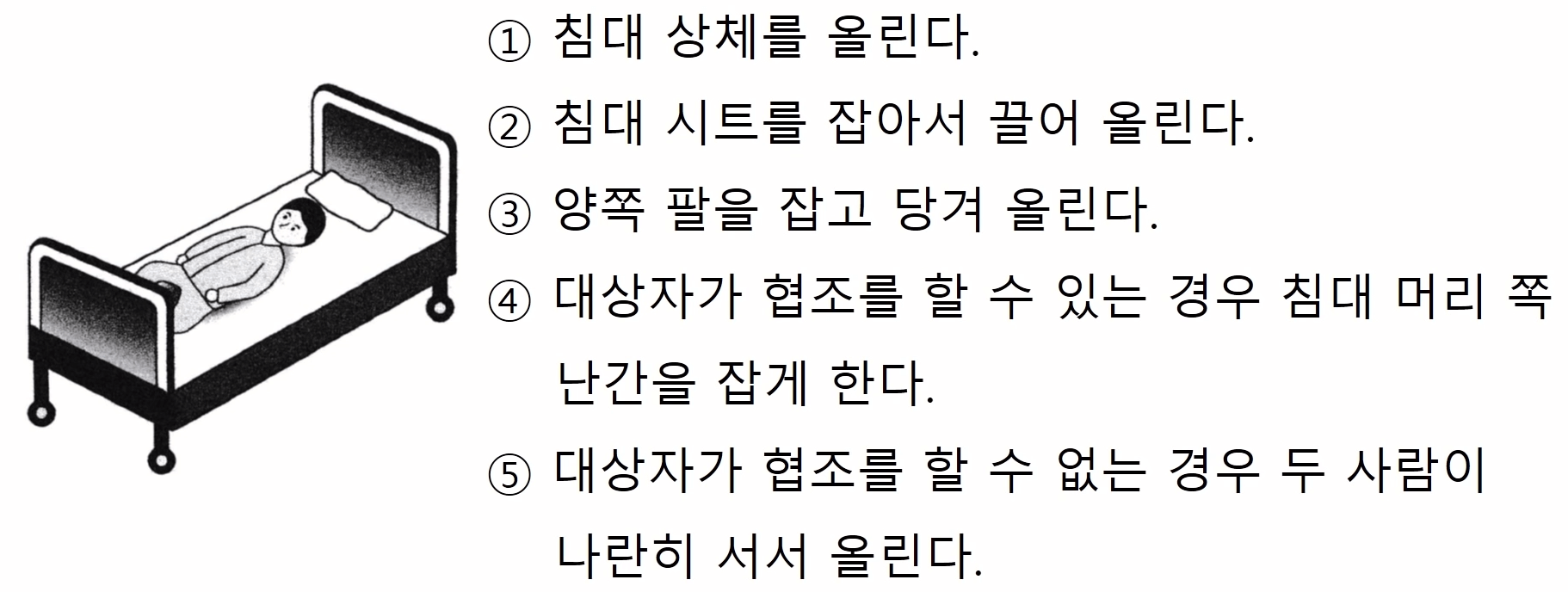 정답 3번 : 침상 양편에 한 사람씩 마주 서서 한쪽 팔은 머리 밑으로 넣어 어깨와 등 밑을, 다른 팔은 둔부와 대퇴를 지지하여 두 사람이 동시에 대상자를 침대 머리 쪽으로 옮긴다.