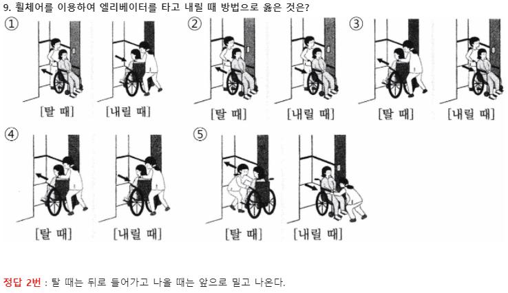 9. 휠체어를 이용하여 엘리베이터를 타고 내릴 때 방법으로 옳은 것은?