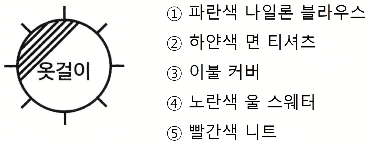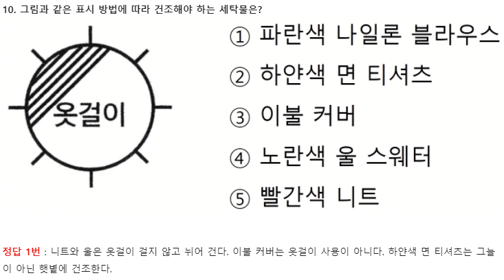 정답 1번 : 니트와 울은 옷걸이 걸지 않고 뉘어 건다. 이불 커버는 옷걸이 사용이 아니다. 하얀색 면 티셔츠는 그늘이 아닌 햇볕에 건조한다.