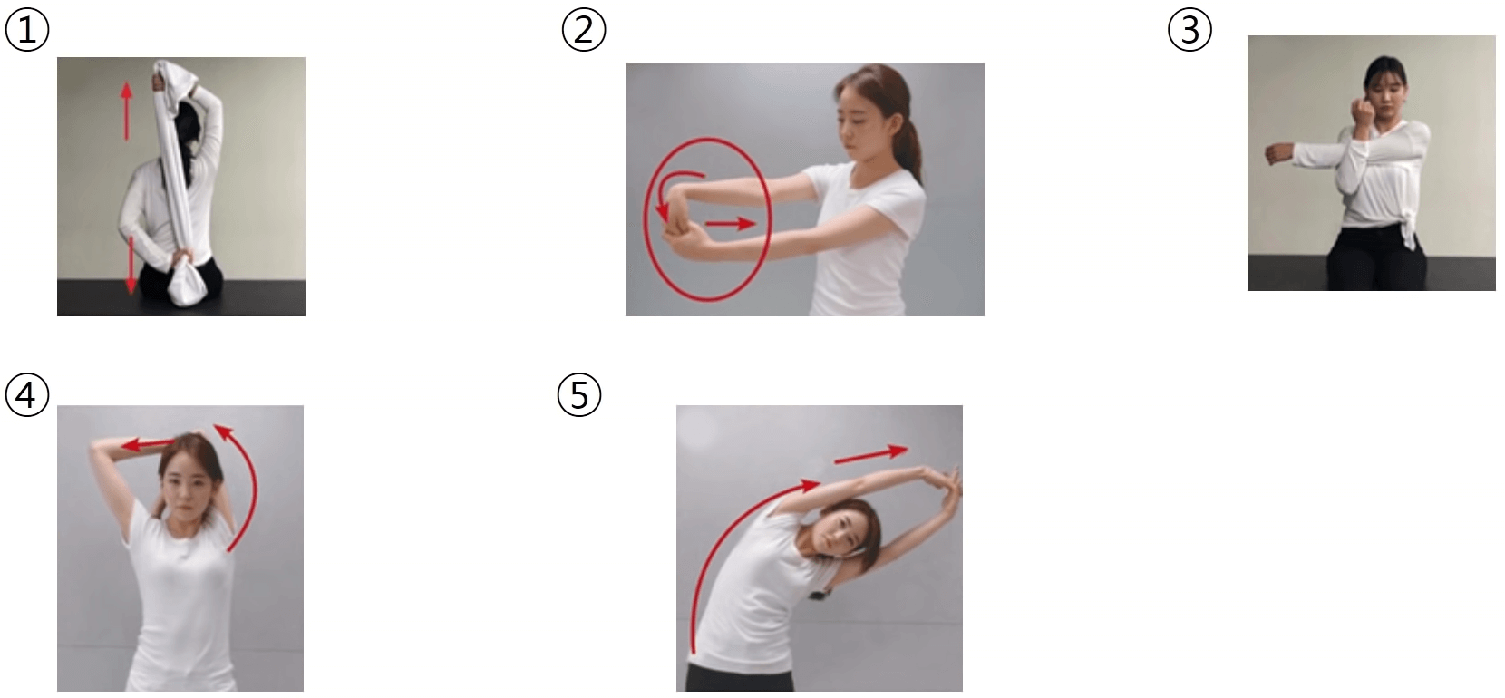 정답 2번 : 손바닥이 몸 쪽으로 향하도록 하고 손등을 잡고 몸 쪽으로 천천히 당긴다. 1, 3번은 어깨 스트레칭, 4, 5번은 전신 스트레칭.