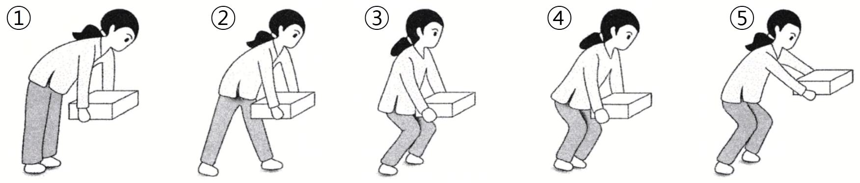6. 요양보호사가 양손으로 물건을 들어 올릴 때 신체손상을 예방하기 위한 자세로 옳은 것은?