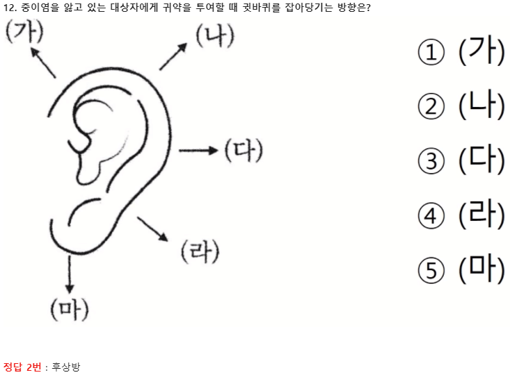 12. 중이염을 앓고 있는 대상자에게 귀약을 투여할 때 귓바퀴를 잡아당기는 방향은?