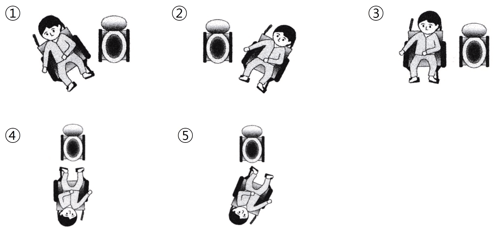 2. 왼쪽 편마비 대상자를 이동 변기로 옮겨 앉힐 때 휠체어 위치로 옳은 것은?