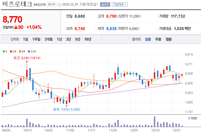 다만 최근 박스권 돌파시 매우 가파른 상승세를 보여 전고점 돌파 전후에 조정을 보일 수도 있는 차트 패턴입니다. 비츠로테크 기존 보유 주주라면 5일 이동평균선을 이탈하지 않을 경우 보유하는 전략으로, 비츠로테크 신규 진입 주주라면 전고점 돌파 후 눌림목을 이용해 추가 매수하는 것이 좋아 보입니다.
