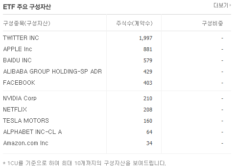 골자는 Intercontinental Exchange 일명 ICE에서 산출하는 NYSE R FANG+ TM 인덱스를 기초 지수로 추종하고 있습니다. 다들 아시는 FANG이 들어가 있는 거죠. 페이스북(F), 아마존(A), 넷플릭스(N), 구글(G). 게다가 플러스로 애플, 테슬라, 트위터, 중국의 알리바바, 바이두, 엔비디아 등에 투자하는 종목입니다.