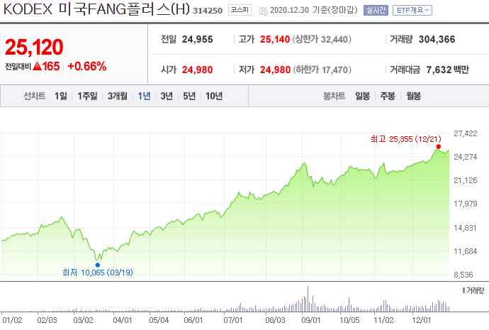그럼 약 12,000 달러, 우리 돈으로 약 1,300만원 가량이 필요합니다. ETF 1주당 가격인 25,120원이랑 비교해봤을 때, 투자하지 못하는 종목에 투자할 수 있습니다. 미국의 대장주만 모아 놓은 KODEX 미국FANG플러스(H) 투자한다면 미국 증시 알짜배기 종목을 적은 금액으로도 분산 투자할 수 있습니다.