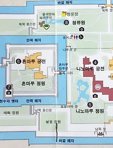 일본 교토 니조성 지도 설명합니다. 자료는 니조성 여행 갔을 때, 받았던 니조성 설명 책자에서 발췌했습니다. 책자에 나온 전체 지도는 아래에 있으며, 걷는 코스 1번부터 9번까지 설명합니다. 사진 촬영 추천 포인트 : 카메라 모양 3, 5, 7, 8번니조성 내부 찻집 : 8번, 청류원 향운정기념품 / 찻집 : 1번 동쪽 성문과 400년 기념 전시관 사이 그리고 휴게소는 니조성 돌담, 청류원, 녹색 정원 옆에 있습니다. 이곳에서 어른들만 하는 연기 태우기 가능하며 자판기도 있습니다. 1. 동쪽 성문니조성의 정문으로 1662년경에 만들어졌다. 축성 당시는 지금과 같이 망루 아래문(2층)이었으나, 간에이(1624-1644년) 시대 니조성 행차 당시는 천황을 2층에서 내려다보지 못하도록 개조되었다고 한다. 2...